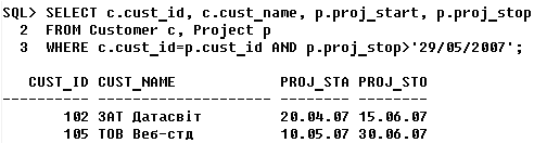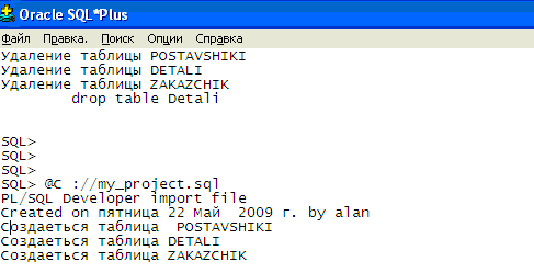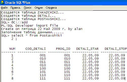 Рис. 9.4 Основне вікно програми з запитом та звітом ВИСНОВОК На сьогоднішній день реляционные бази даних залишаються найпоширенішими, завдяки своїй простоті й наочності як у процесі створення так і на користувальницькому рівні. Основним достоїнством реляционных баз даних сумісність із самою популярною мовою запитів SQL. За допомогою єдиного запиту на цій мові можна з'єднати кілька таблиць у тимчасову таблицю й вирізати з її необхідні рядки й стовпці (селекція й проекція). Тому що таблична структура реляционной бази даних інтуїтивно зрозуміла користувачам, те й мова SQL є простим і легенею для вивчення. Реляционная модель має солідний теоретичний фундамент, на якому були засновані еволюція й реалізація реляционных баз даних. На хвилі популярності, викликаної успіхом реляционной моделі, SQL став основною мовою для реляционных баз даних. У процесі аналізу вищевикладеної інформації виявлені наступні недоліки розглянутої моделі баз даних: – тому що всі поля однієї таблиці повинні містити постійне число полів заздалегідь певних типів, доводиться створювати додаткові таблиці, що враховують індивідуальні особливості елементів, за допомогою зовнішніх ключів. Такий підхід сильно ускладнює створення скільки-небудь складних взаємозв'язків у базі даних; – висока трудомісткість маніпулювання інформацією й зміни зв'язків. СПИСОК ВИКОРИСТАНОЇ ЛІТЕРАТУРИ 1. Конноли Томас. Базы данных: проектирование, реализация и сопровождение. Теория и практика, 2-е изд.: Пер. с англ.: Уч. пос. – М.: Издательский дом "Вильямс", 2004. – 1120 с. 2. К. Дж. Дейт. Введение в системы баз данных, 6-е издание: Пер. с англ. – К.; М.; СПб.: Издательский дом "Вильямс", 2003. – 848 с. 3. Саймон А.Р. Стратегические технологи баз данных: менеджмент на 2005 год. Перевод с англ./ Под ред. и с предисл. М.Р. Когаловского. – М.: 4. ДСТУ 2874-05. Бази даних. Терміни та визначення. — Київ: Держстандарт України, 2004. - 32 с. 5. ДСТУ 2940-94. Системи оброблення інформації. Керування процесами оброблення даних. Терміни та визначення. — Київ: Держстандарт України, 2005. - 20 с. ДОДАТОК А Файли-скріпти --del.sql --скрипт для видалення таблиць prompt PL/SQL Developer import file prompt Created on вторник 22 Мая 2009 г. by alan set feedback off set define off prompt Удаление таблицы Postavshiki…. drop table Postavshiki; prompt Удаление таблицы Detali... drop table Detali; prompt Удаление таблицы Zakazchik... drop table Zakazchik; prompt Удаление таблицы Postavshiki…. drop table Postavshiki; prompt Удаление таблицы Detali... drop table Detali; prompt Удаление таблицы Zakazchik... drop table Zakazchik; prompt Удаление таблицы Postavshiki…. drop table Postavshiki; prompt Удаление таблицы Detali... drop table Detali; prompt Удаление таблицы Zakazchik... drop table Zakazchik; --кінець --my_project.sql --скрипт для створення таблиць prompt PL/SQL Developer import file prompt Created on вторник 22 Мая 2009 г. by alan set feedback off set define off prompt Создаётся таблица Detali... CREATE TABLE Detali ( kod_detali NUMBER(3) NOT NULL PRIMARY KEY, nazvanie VARCHAR(60), articul VARCHAR(20), primechanie VARCHAR(30), prompt Создаётся таблица Postavshiki... CREATE TABLE Postavshiki ( kod_postavshika NUMBER(3) NOT NULL PRIMARY KEY, nazvanie VARCHAR(60), adress VARCHAR(20), telefon NUMBER(15), prompt Создаётся таблица Zakazchik... CREATE TABLE Zakazchik ( proj_zakazchika NUMBER(3) NOT NULL PRIMARY KEY, trade_mark VARCHAR(30), dejatelnost VARCHAR(50), raspologenie VARCHAR(33), --кінець -add.sql --скрипт для додавання даних prompt PL/SQL Developer import file prompt Created on вторник 22 Мая 2009 г. by alan set feedback off set define off prompt Заполнение таблиц данными... insert into Detali values (01, Двигун', 'Імпортований', 'Присутній на складі' ); insert into Postavshiki values (11, 'ХарківАвто', 'Пушкінська 91', '312-41-21' ); insert into Zakazchik values (10, 'Helenvagen', 'Німеченна' ); --кінець |