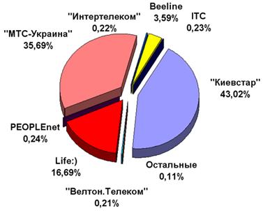 Рис. 2. Оператори стільникового зв’язку Виходячи із наведеної таблиці, залишається зробити висновок, що найбільші GSM-оператори починають поступово списувати неактивні SIM-карти. Так за минулий місяць в "Київстару" різниця між активованими й списаними картками склала 161 тисячу на користь списаних. В "МТС-Україна" ситуація аналогічна, тільки от масштаб цифр ще більш істотний, перевага списаних номерів склала 244 тис. шт. Після переходу на нову систему підрахунку абонентів і великих списань, Beeline знову показав позитивну статистику. Так за останній місяць зими його абонентська база збільшилася майже на 0,5%. Після зимової сплячки, "бджоли" знову почали збільшувати свій рій. Зате life:), не знижуючи обертів, продовжує активними темпами набирати до своїх лав нових абонентів. Ще трохи, і власників SIM-карти зі смайликом буде вже 10 мільйонів. Якщо дивитися на кількісні показники, то найвищий приріст абонентської бази в CDMA-оператора "Телесистеми України", що надає послуги мобільного зв'язку під брендом PEOPLEnet. Однак настільки високий результат отриманий не завдяки підключенням нових абонентів, а шляхом об'єднання в підрахунках баз цієї компанії й оператора CST Invest. Чисте ж підключення PEOPLEnet склало трохи менше шести тисяч абонентів. До речі, на сьогодні PEOPLEnet має найбільшу абонентську базу серед CDMA-операторів, однак протриває це не довго, адже вже незабаром повинні закінчитися всі формальності із придбанням компанією ITC оператора "Велтон.Телеком". Тоді завдяки об'єднанню двох великих гравців CDMA-ринку, з'явиться новий сильний гравець, здатний затьмарити успіхи як PEOPLEnet, так і національного "Інтертелекому". Ринок інтернету в Україні. Види доступу. Якщо раніше, більшість інтернетників використововали комутований доступ — dial-up, який здійснюється за допомогою звичайної телефонної лінії, що забезпечує низьку швидкість — до 56 кбіт то зараз ситуація змінилася. Все більше і більше людей корисутются послугами виділених високошвидкісних ліній для доступу в інтернет. Ємність ринку * чисельний обсяг ринку — 2,5 —9,8 млн. чол. * кількість сталих користувачів тенет — 1 —1.5 млн. чол. * ємінсть ринку — $144 млн. — (2005) За інформацією НКРЗ, кількість української інтернет-аудиторії складає від 2,5 до 9,8 мільйонів клієнтів. В той же час, за даними Інтернет-асоціації України (ІНАУ), кількість постійних користувачів Мережі не перевищує 1—1.5 мільйонів чоловік. Ємність ринку за засобами * dial-up — 75% * виділені лінії — 11% * кабельні мережі та радіодоступ — 5% * DSL — 2% * Ethernet-доступ — 2% Згідно з даними асоціації "Телас" сьогодні 75% ринку доступу припадає на dial-up. З чверті, що залишилася, 11% — на виділені лінії, по 5% — на кабельні мережі і радіодоступ, 2% — на технологію DSL. Ще 2% займають локальні мережі, реалізовані за допомогою технології Ethernet. Ємність ринку за регіонами. У структурі ринку Київ, який генерує близько 60% його доходів, як і раніше на голову випереджає регіони. Але останнім часом на місцях активно скорочується відставання від столиці. Торішнє (2005) зменшення частки Києва в доходах ринку до 58% (у 2004 р. — 65%) експерти пояснюють зміною тарифів. Найкрупніші оператори * "Укртелеком", * "Фарлеп" * "Оптіма" * "Воля-Кабель" * "Ґолден телеком" * "Лакі Нет" При тому, що на ринку сьогодні працює близько 4,5 тисяч провайдерів, більше 60% доходів одержують шість найбільших компаній — "Укртелеком", "Фарлеп", "Оптіма",