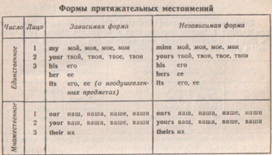 4.2 Притяжательные местоимения Личным местоимениям соответствуют следующие притяжательные местоимения (Possessive Pronouns): my мой, моя, мое, your твой, твоя, твое, твои, his его, her ее, its его, ее, our наш, наша, наше, наши, your ваш, ваша, ваше, ваши, their их. Притяжательные местоимения в предложении выражают принадлежность и отвечают на вопрос whose? чей? Они имеют две формы: зависимую и независимую.